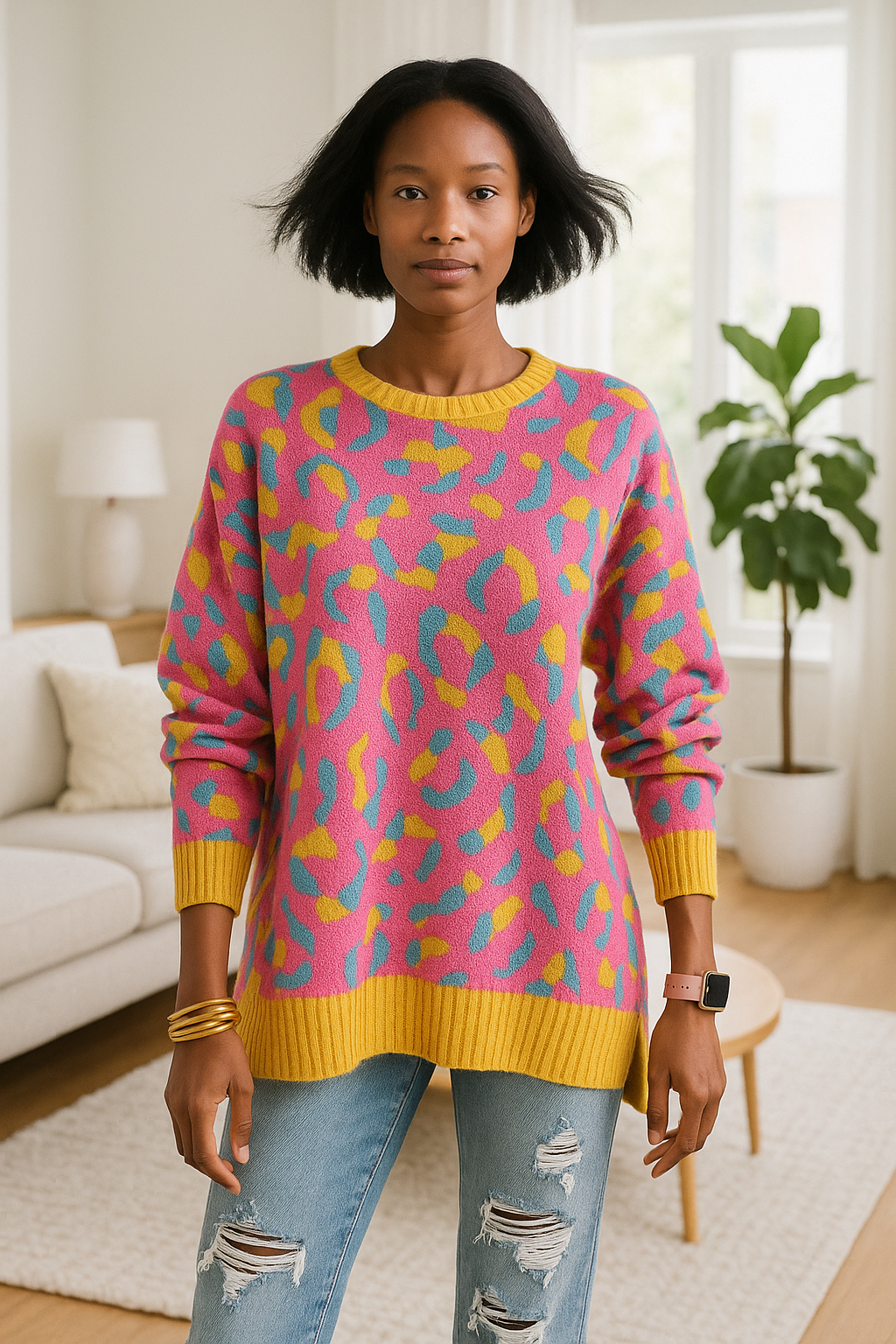 This abstract sweater offers a bold and artistic statement.