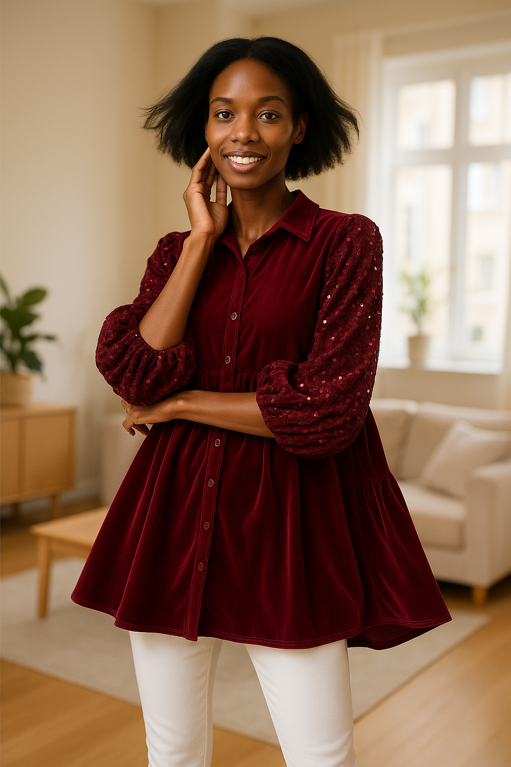 The Sequin Detail Tiered Back Half Sleeve Shirt is a stunning and unique piece that combines sparkle with a touch of whimsy. The sequin detailing adds a glamorous and eye-catching element to the shirt, perfect for adding some sparkle to your outfit. The tiered back design adds a playful and flirty twist, offering movement and visual interest. The half sleeves provide a chic and versatile look that can be dressed up or down for any occasion. Elevate your style with this statement shirt that is sure to make you stand out in the crowd.